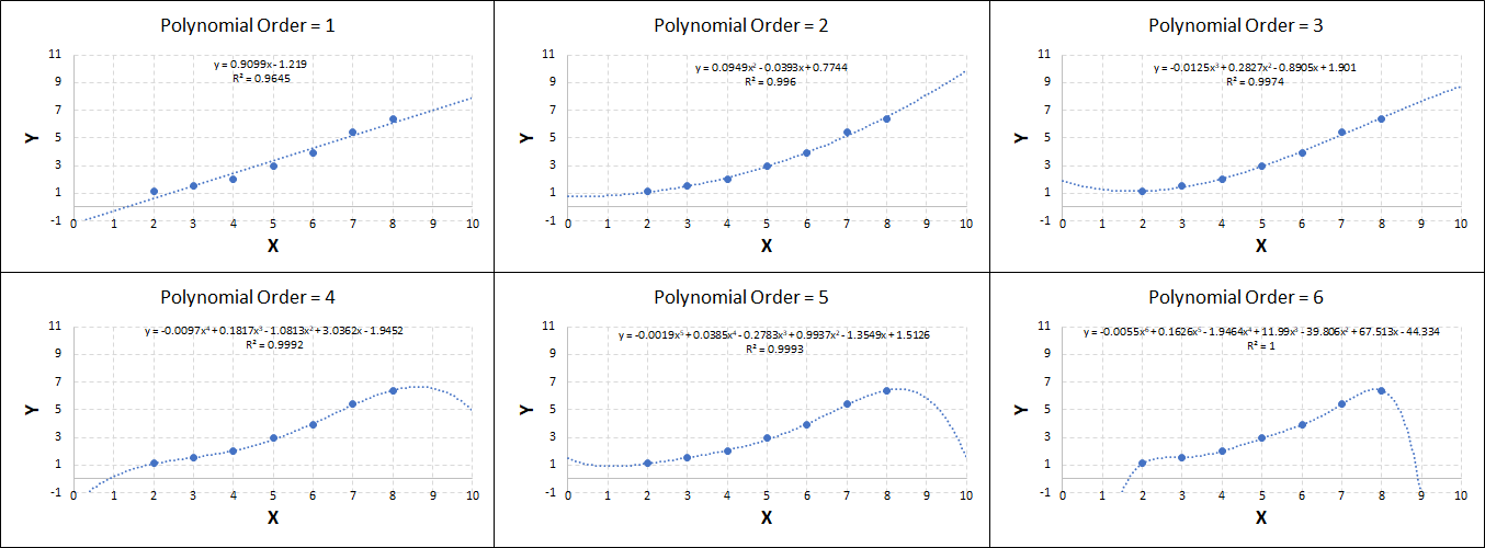 Note that when the polynomial order = 1 (i.e. a linear model), the r2 value is lower than any of the other models. Also, given that we know the function is proportional to x2, the extrapolation capability of this linear model is very poor. That the model predicts well across the interpolation range is purely because I limited the range of the data for illustrative purposes in this example.