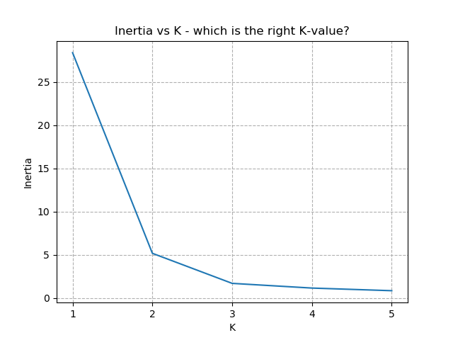 It is immediately clear that the biggest bang-for-buck reductions-per-K is between 2-3. Therefore, one of these values is the most appropriate for how to classify our data. Remember I said before that the Setosa group is simple to identify against the other two groups, and that Versicolor and Virginica show some overlap between features? That is exactly what we are seeing here - K=2 becomes "Setosa" and "Not Setosa", and K=3 identifies each group, but as Versicolor and Virginica have similar dimensions, the distance-reduction is less pronounced.