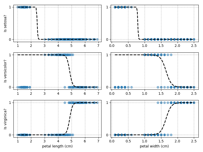 Right then - onto applying this to our Iris dataset. Using petal length and width as independent predictors, we can calculate the probability of any given point being whichever of the 3 classes. Remember: logistic regression is a binary classifier, meaning it can only work between two individual classes. Therefore, we need to run the regression twice for each point - once to determine whether it is Setosa / Not Setosa, and again to determine if it is Virginica / Versicolor.