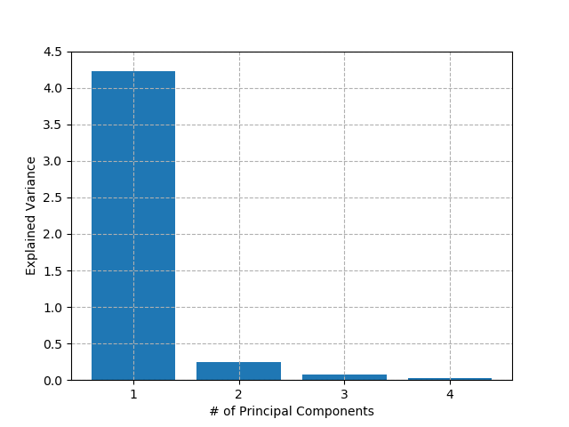 As suspected, the first principal component accounts for about 90% of all variance in the dataset. In theory then, we could train all of our classification and regression models on this decomposed dataset without losing too much accuracy, and they would be much faster to train and predict. However, in this case, we have only 150 data-points and 4 features so any performance gains are negligible in a real-world context. For certain applications e.g. image-classification, which may have millions of inputs, these gains could be significant. It won't surprise you to learn that, once again, any techniques employed and associated gains / losses are for the analyst to decide.
