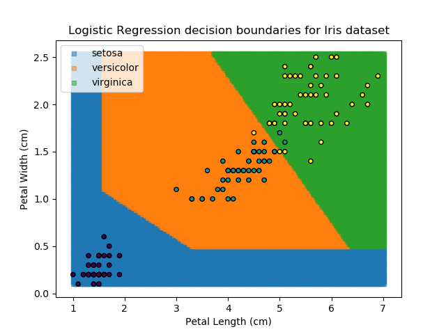 Right then - onto applying this to our Iris dataset. Using petal length and width as independent predictors, we can calculate the probability of any given point being whichever of the 3 classes. Remember: logistic regression is a binary classifier, meaning it can only work between two individual classes. Therefore, we need to run the regression twice for each point - once to determine whether it is Setosa / Not Setosa, and again to determine if it is Virginica / Versicolor.