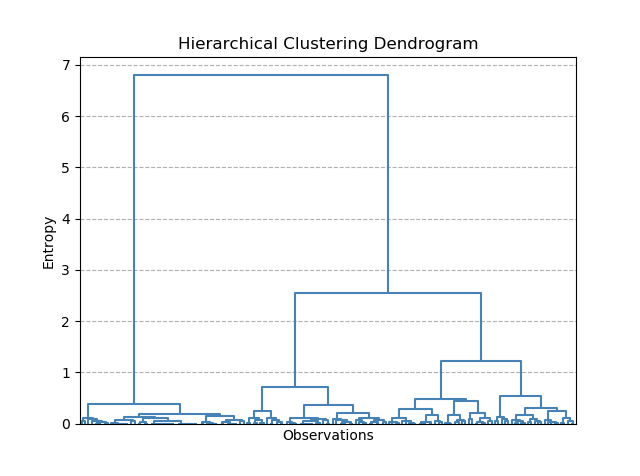 Dendrograms can be tricky to interpret at first. Here, the y-axis is the Entropy score, and the x-axis is each of our individual observations. Don't worry too much about the lowest entropy scores, where the plot is very busy - this has been shown just to make it clear what the dendrogram is plotting (I figured it might be tricky to understand if the plot was pruned to show only the higher levels).